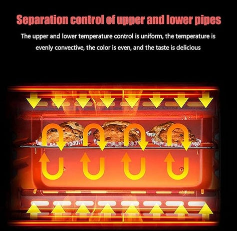 – Separate control for upper and lower heating pipes ensures uniform cooking results.