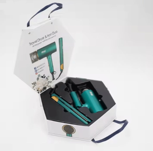 Travel Hair Dryer & Straightener Iron Duo Set – Compact Styling Kit with Gift Box