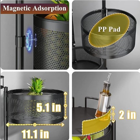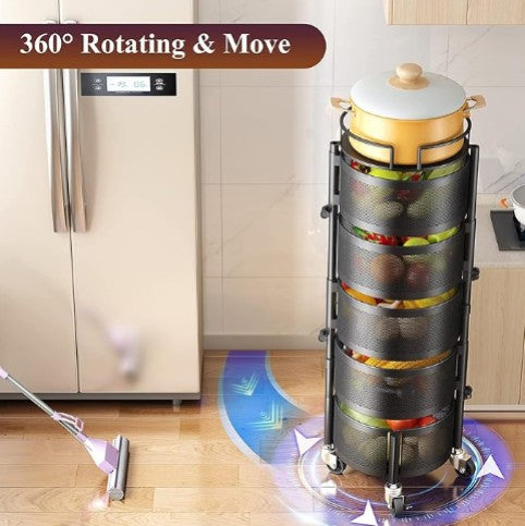 Rotating Basket Storage Rack – A multi‑tier, 360° rotating organizer with mesh baskets and rolling wheels, perfect for storing fruits, vegetables, snacks, toiletries, and household essentials in any room.
